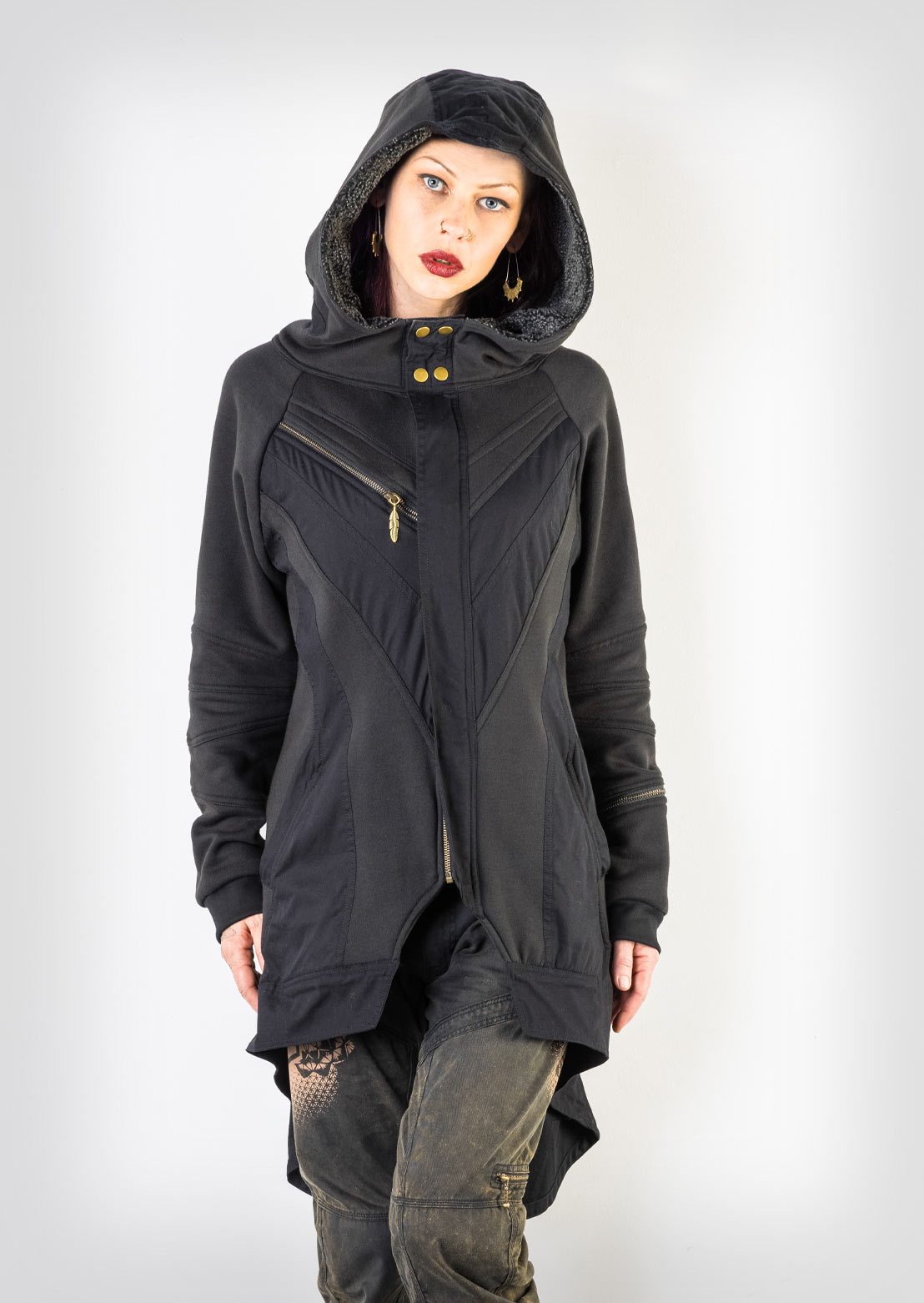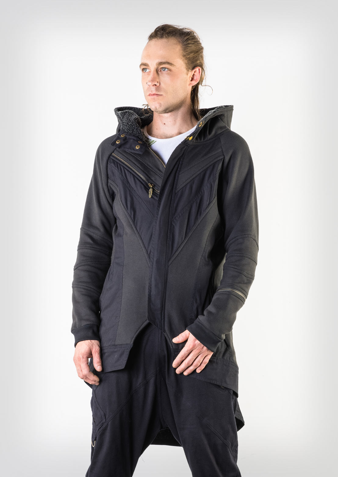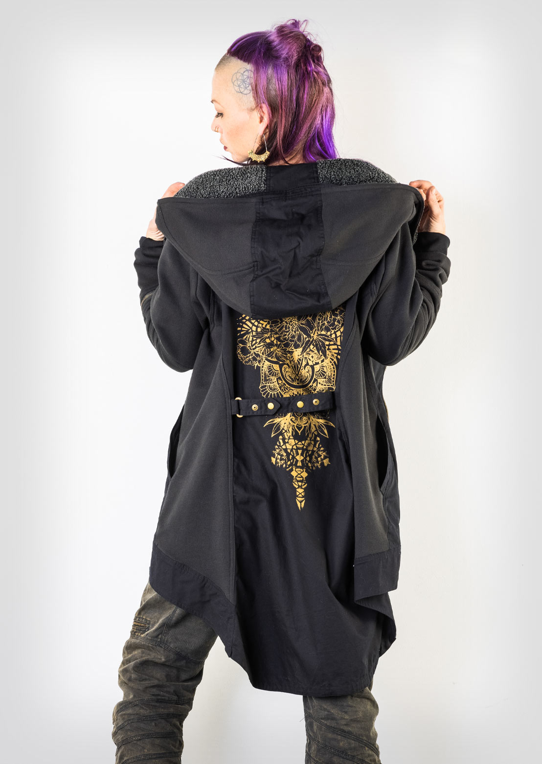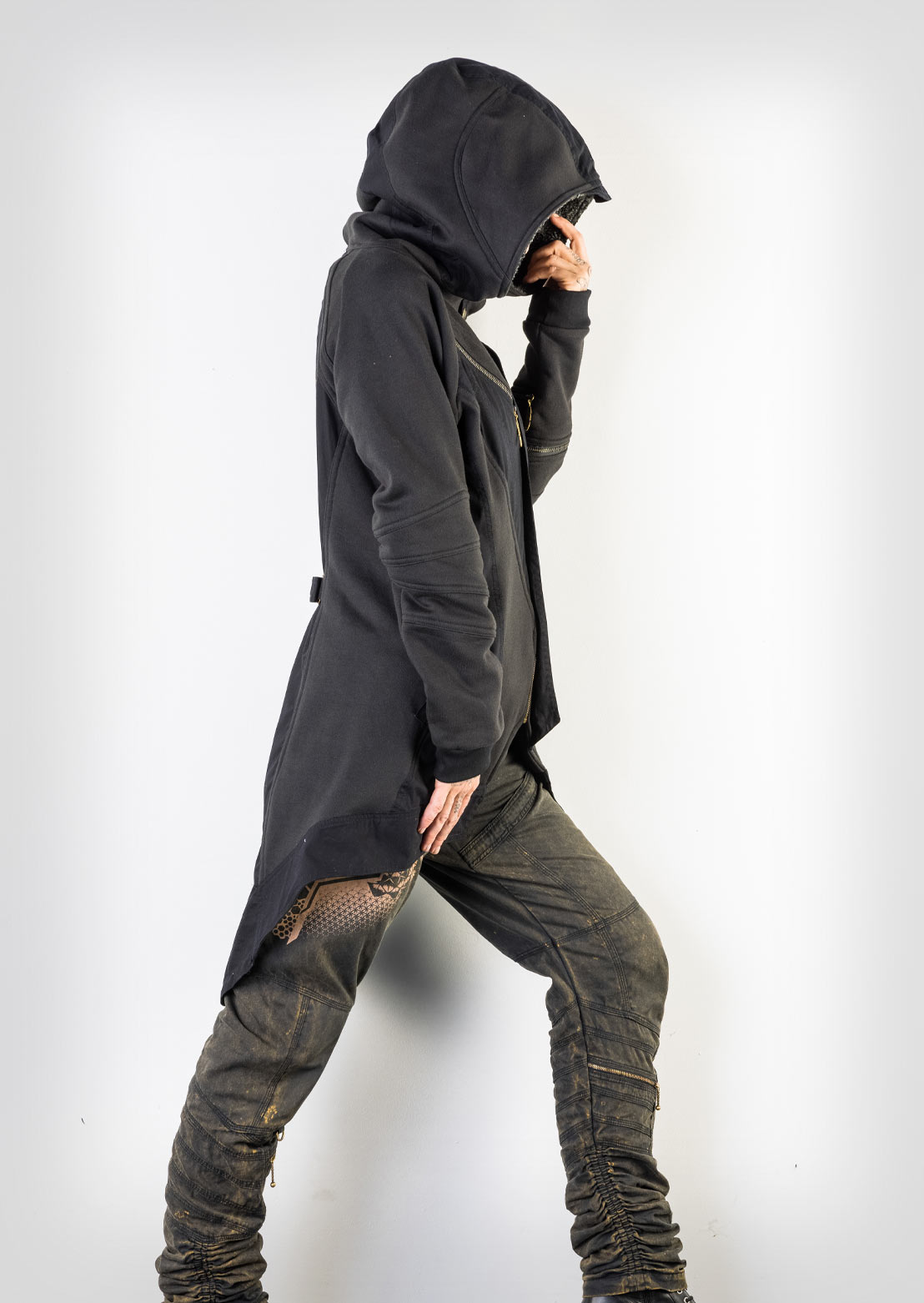 This UNISEX jacket is truly a work of art. Its unique cut can be worn in multiple ways depending on what you wear it with or how cozy you want to be.