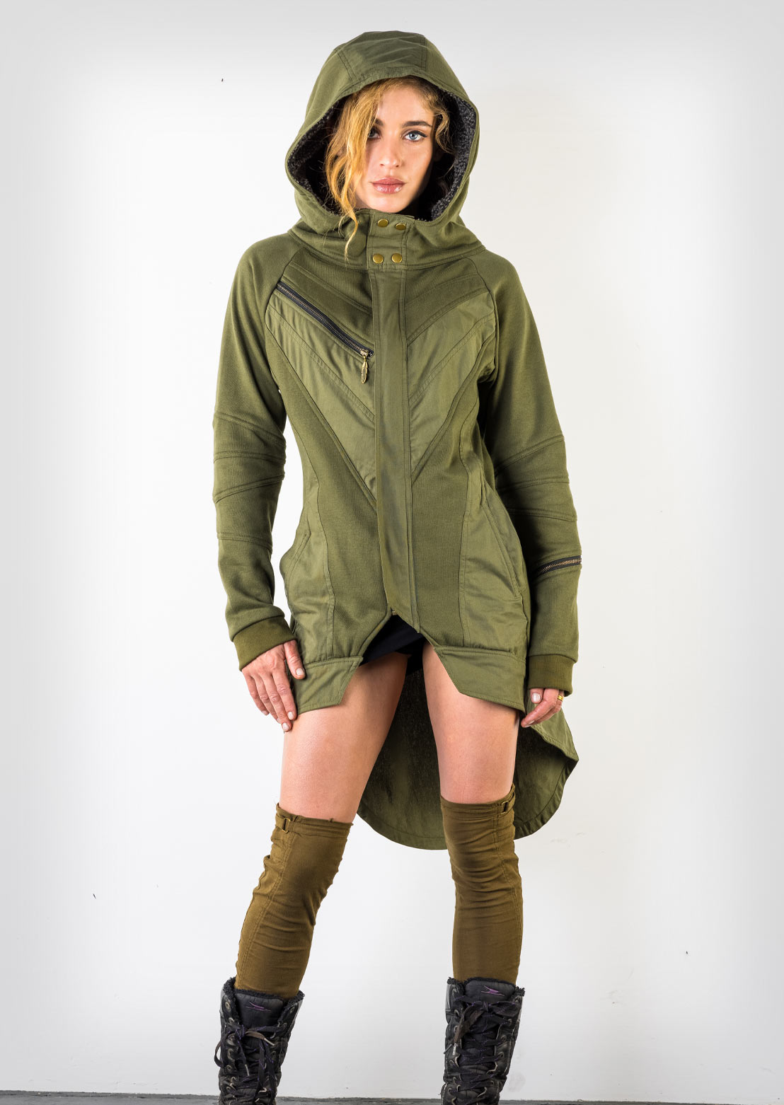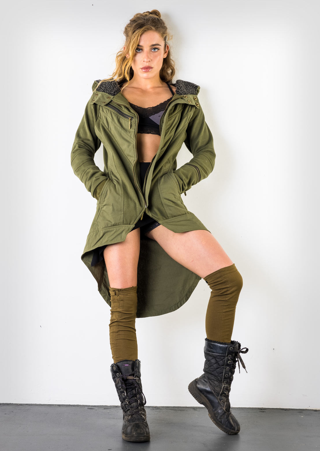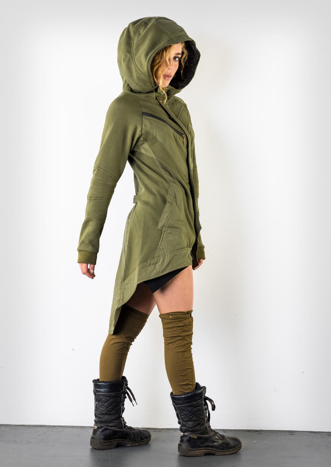 Featuring many pockets, zips, and a big hood! The high collar has a faux fur inside, for extra warmth and style.