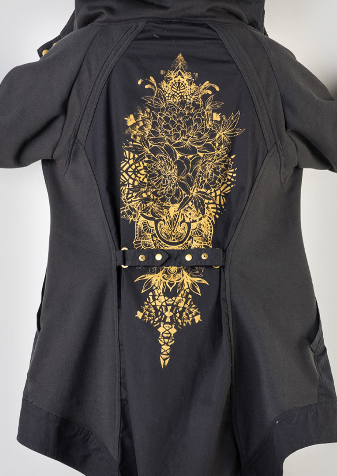 The back is Longer with a Tattoo inspired print, and an adjustable strap, so you can wear it tight or loose over your waist. The guys can probably take this strap out completely.