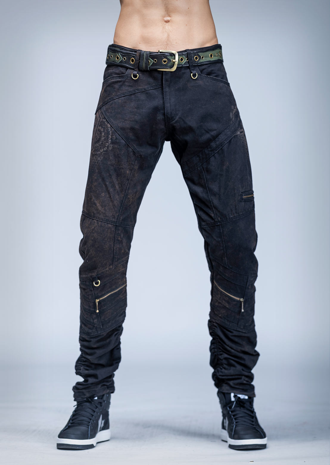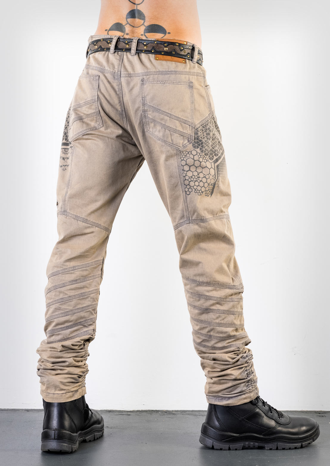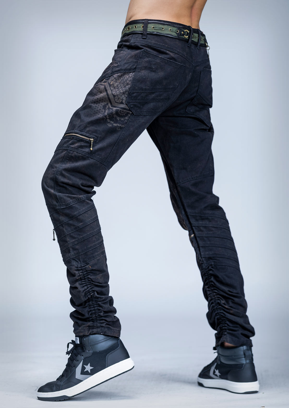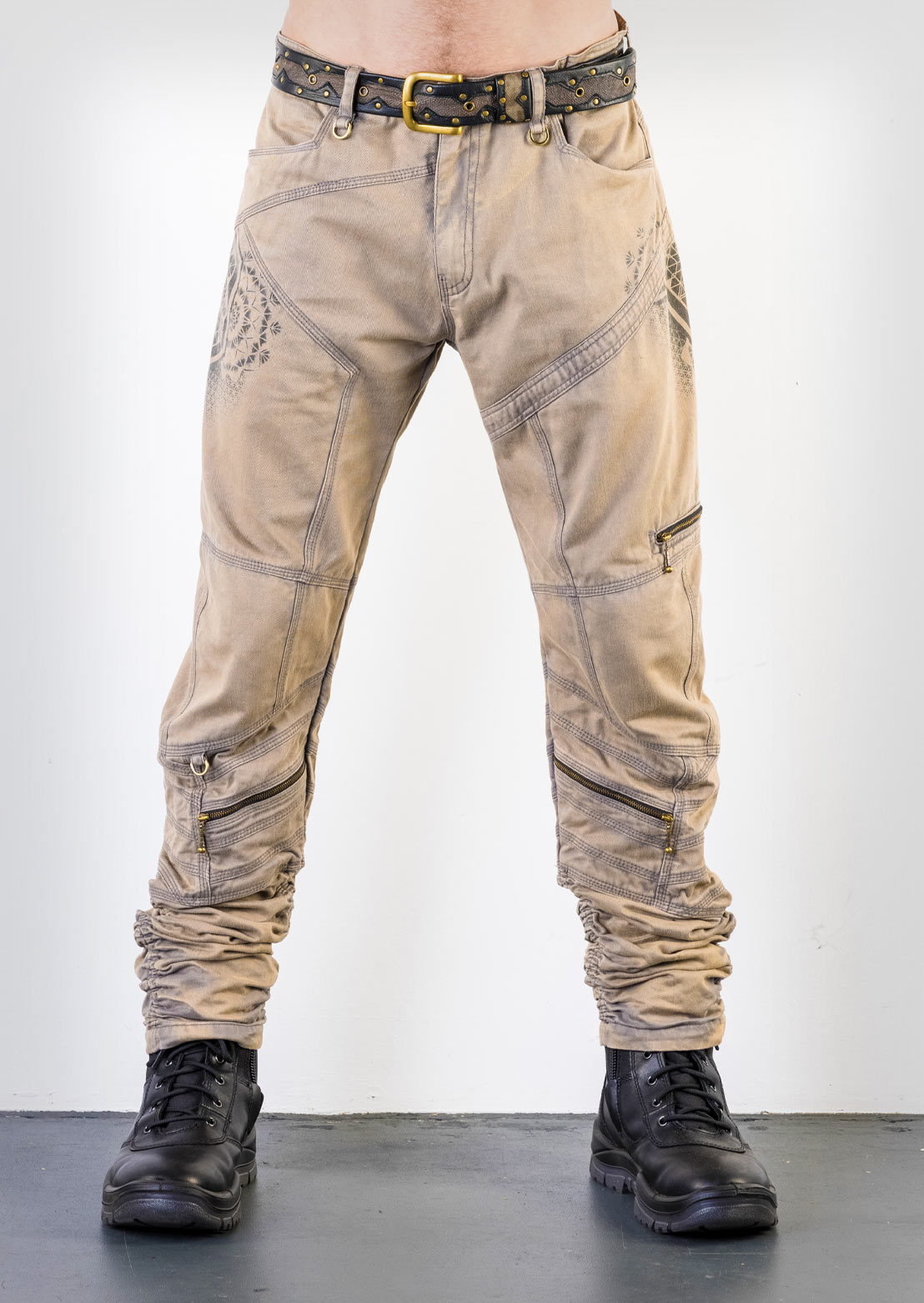 Crafted from lightweight stone-washed cotton twill, these pants offer comfort and durability. They feature a tattoo-inspired print in asymmetric locations, adding a unique and edgy touch. Brass studs and plenty of pockets provide both style and practicality, ensuring you have everything you need right at your fingertips.