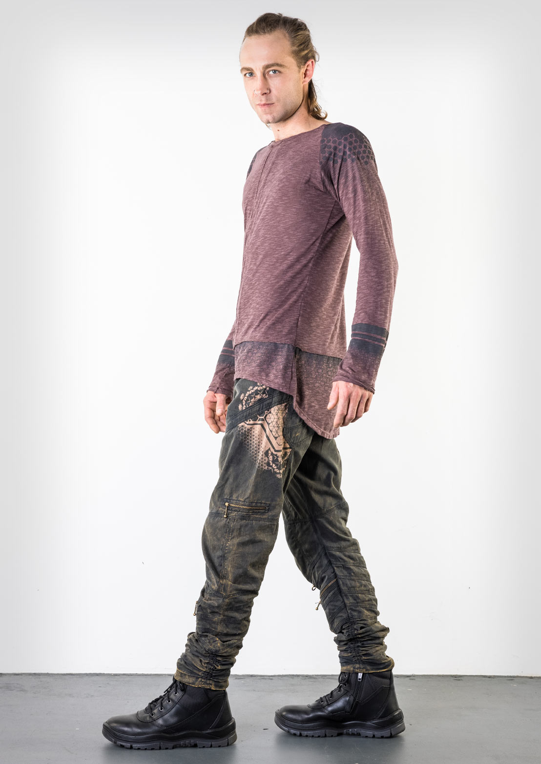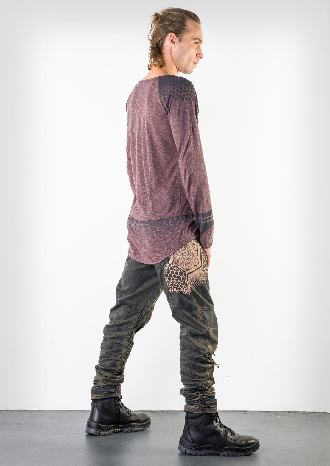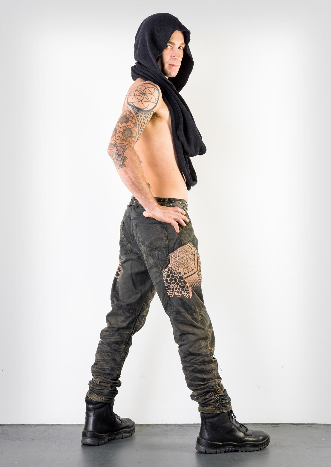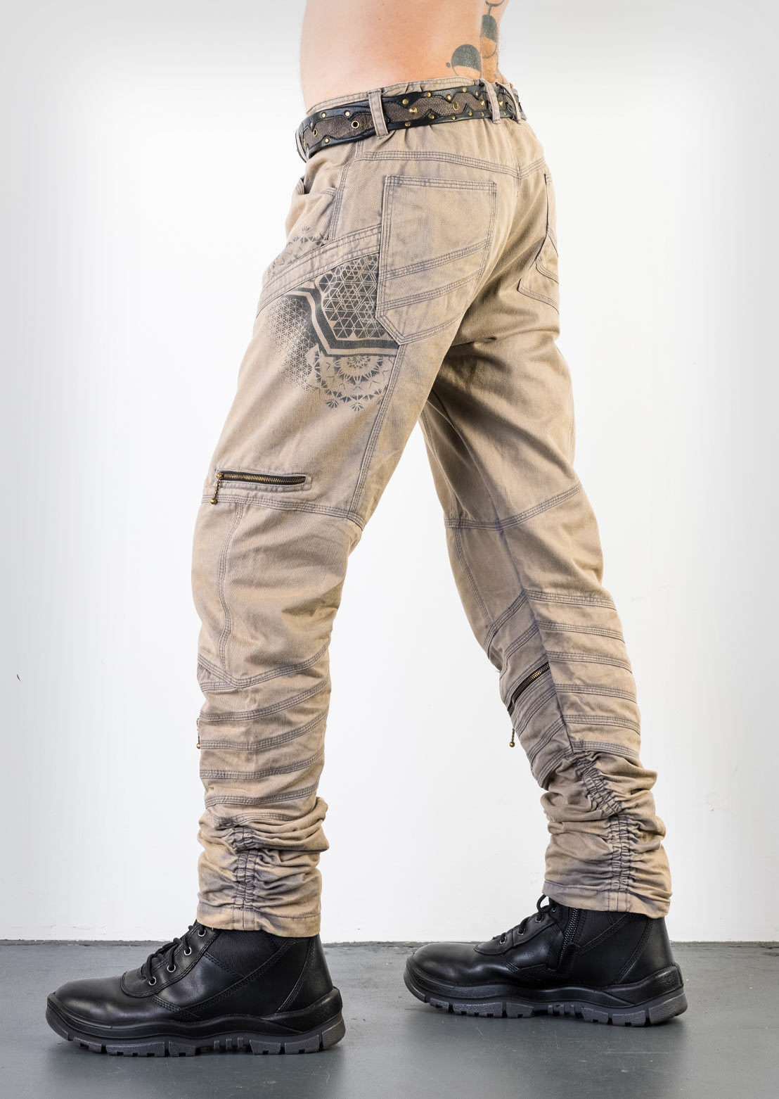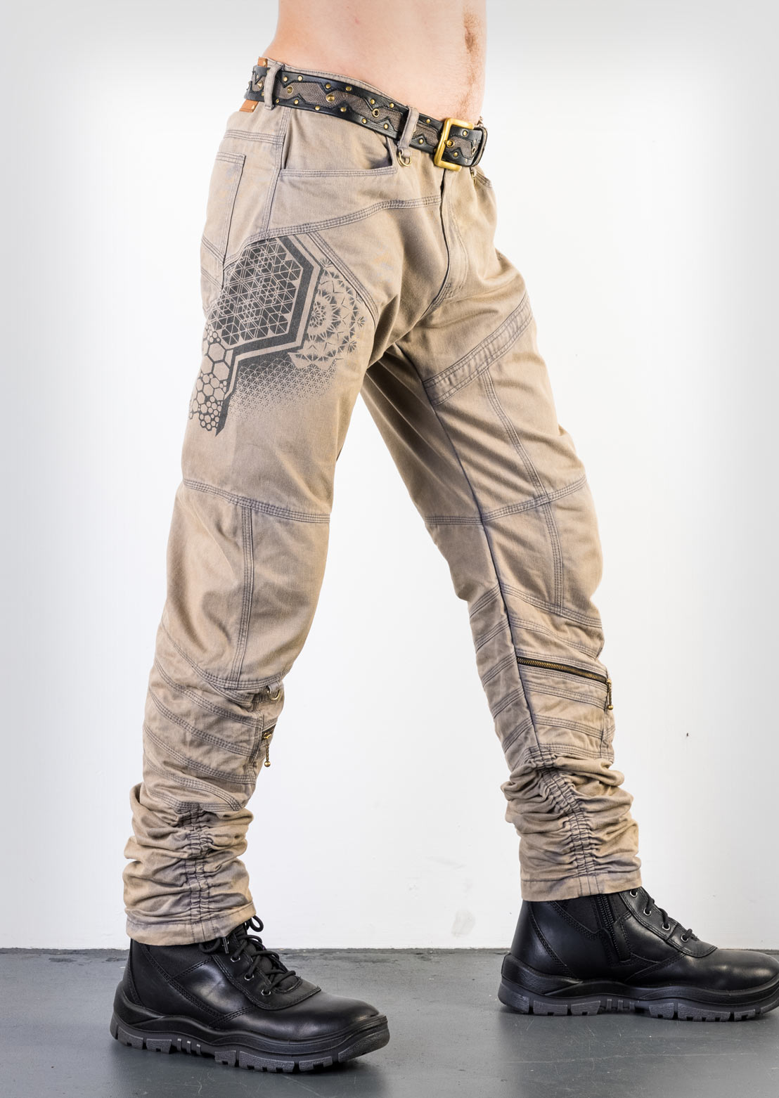 Crafted from lightweight stone-washed cotton twill, these pants offer comfort and durability. They feature a tattoo-inspired print in asymmetric locations, adding a unique and edgy touch. Brass studs and plenty of pockets provide both style and practicality, ensuring you have everything you need right at your fingertips.
