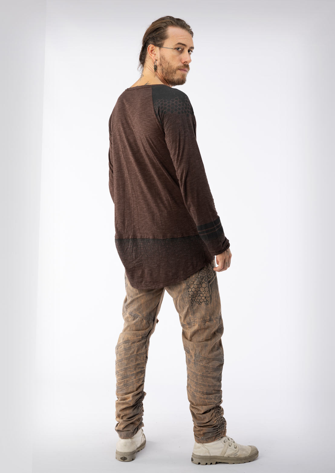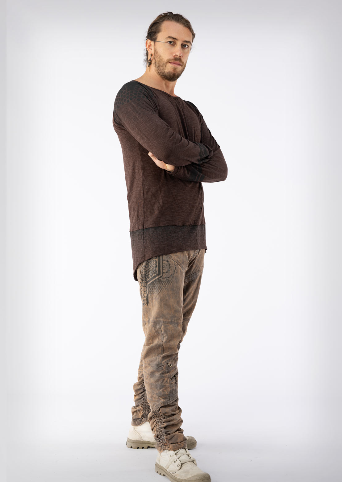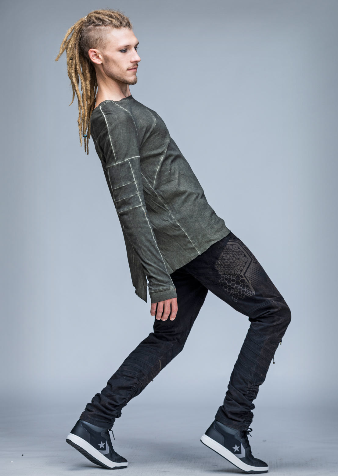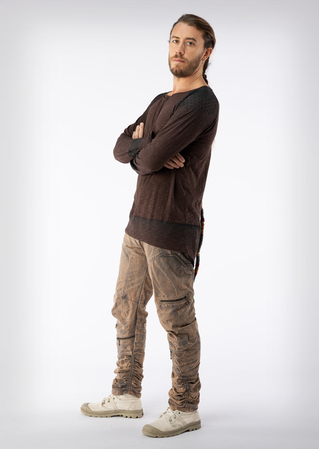 Crafted from lightweight stone-washed cotton twill, these pants offer comfort and durability. They feature a tattoo-inspired print in asymmetric locations, adding a unique and edgy touch. Brass studs and plenty of pockets provide both style and practicality, ensuring you have everything you need right at your fingertips.