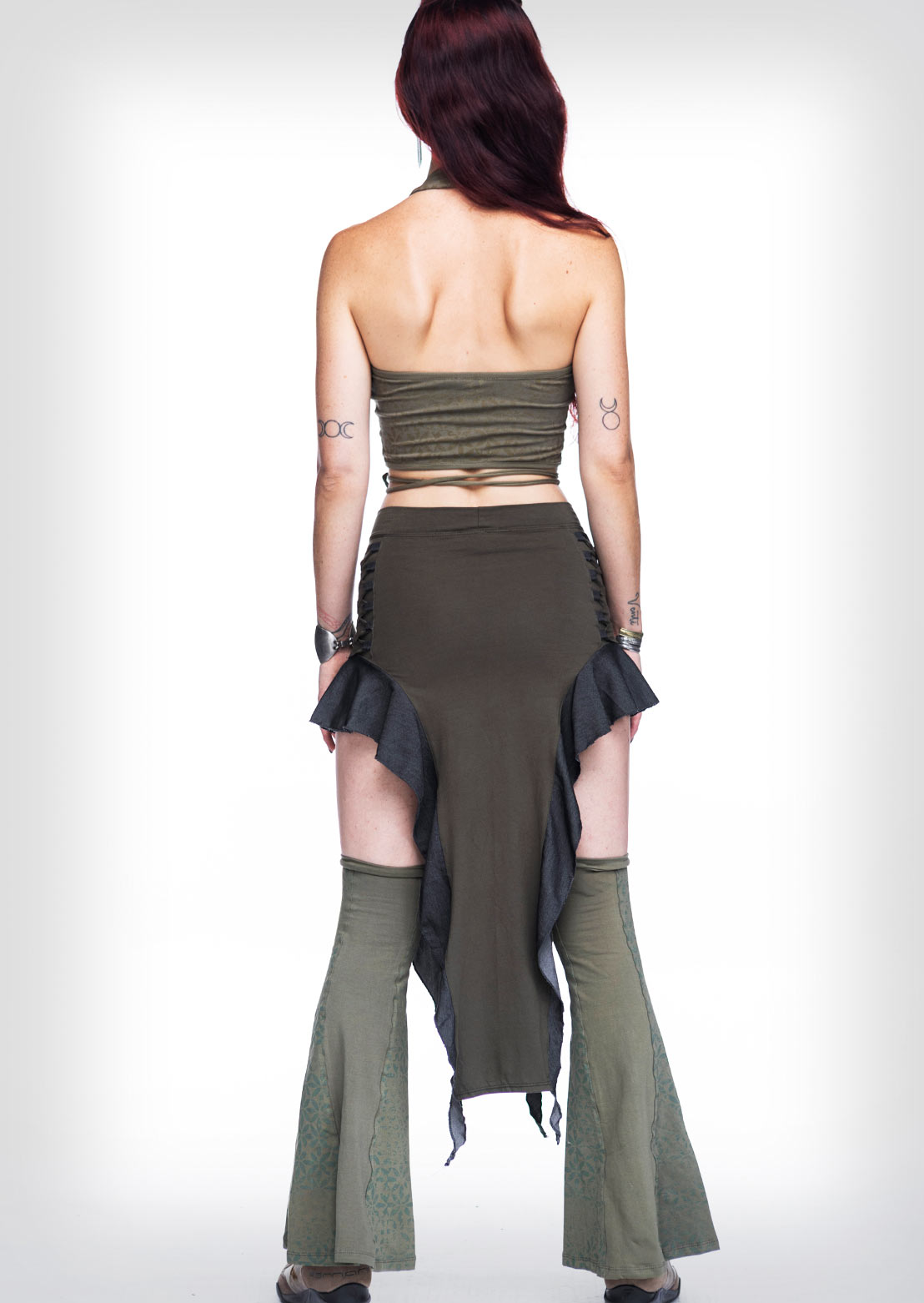 Add a playful twist to your festival wardrobe with the Frill Skirt—a flirty, lap-lap style skirt crafted from soft, stretchy rayon. Open sides trimmed with frilly denim fabric add a touch of flair, making it perfect for twirling on the dance floor or layering over your favorite leggings. This versatile skirt brings a cute, carefree vibe to any outfit, making it a go-to piece for festivals, beach days, or wherever your adventures take you.