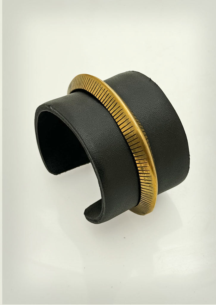 The Ironhide Cuff is crafted with a double leather base that curves naturally around the wrist for a comfortable, secure fit. A central brass panel runs along the cuff, adding strength and visual impact. Lightly adjustable and easy to wear, it is a statement bracelet on its own.