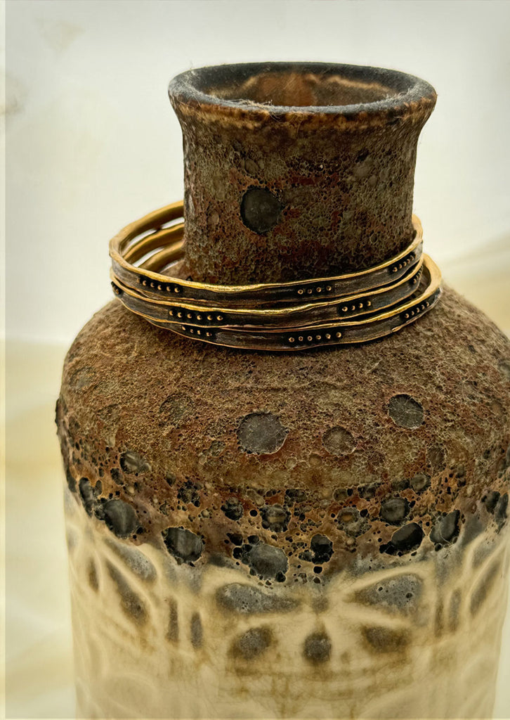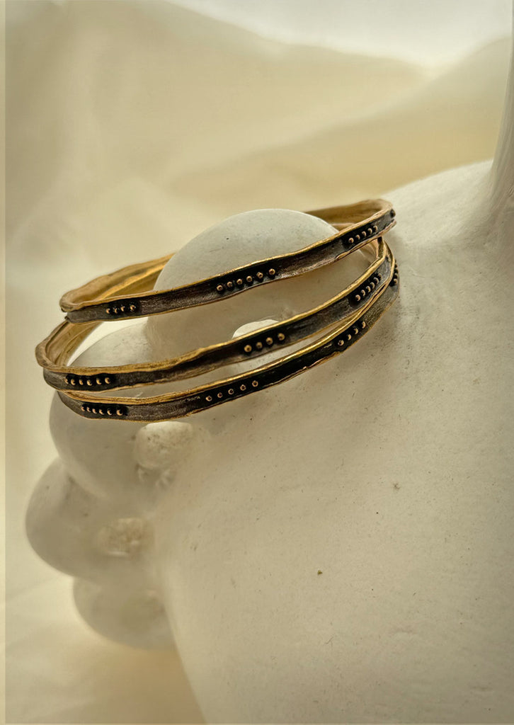 The Trace Bangles carry a natural, organic character, with softly raw edges that curve in an uneven, fluid way. Subtle 3D dot detailing runs along the center, adding texture and depth. Worn alone, they offer a delicate, understated elegance; layered together, they create a bold statement that moves beautifully with you.