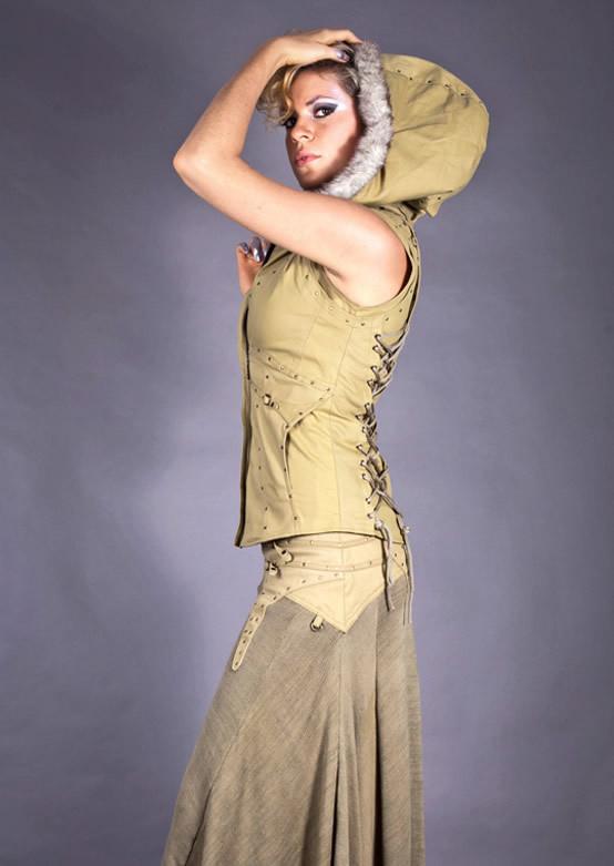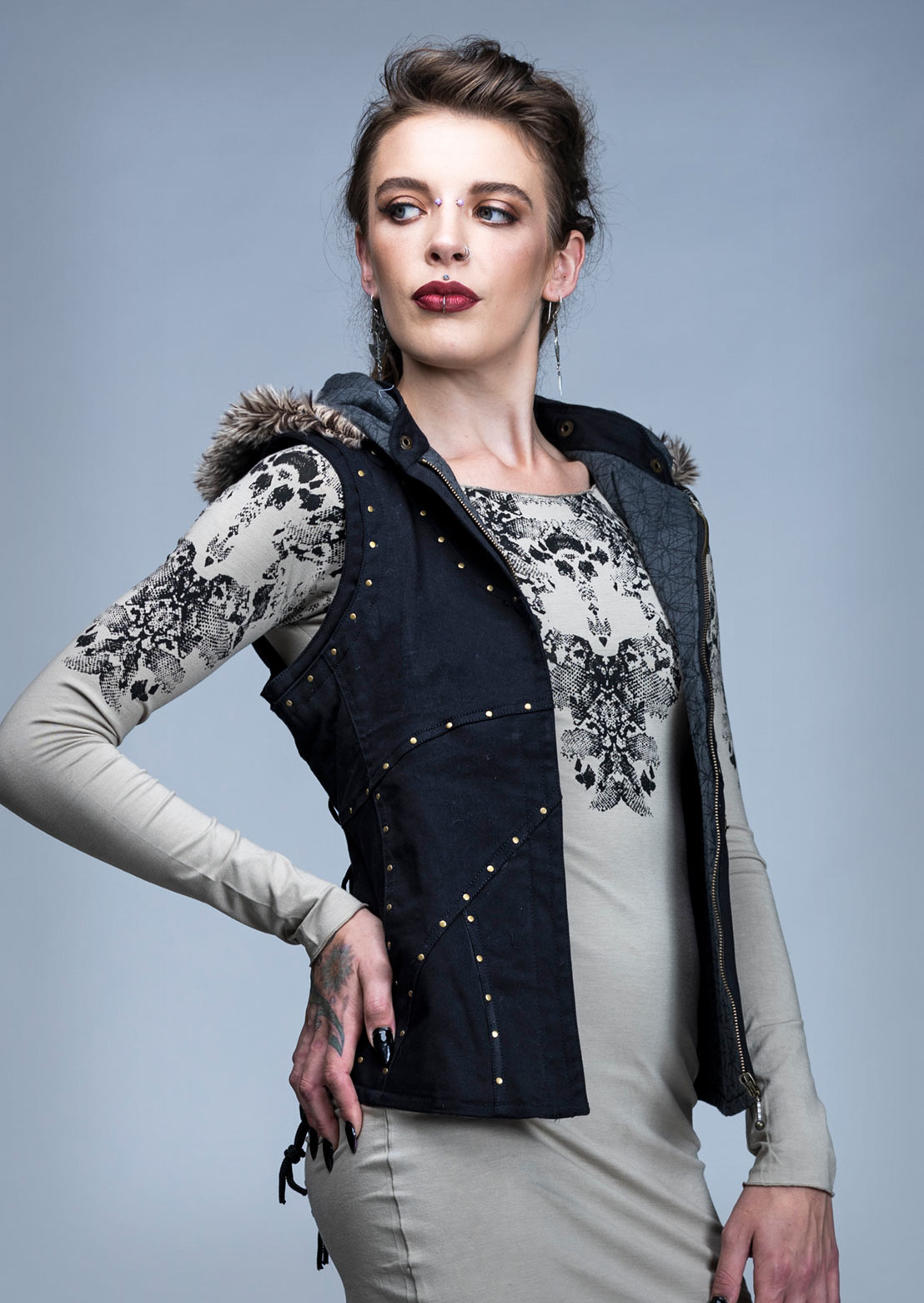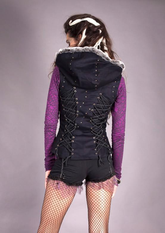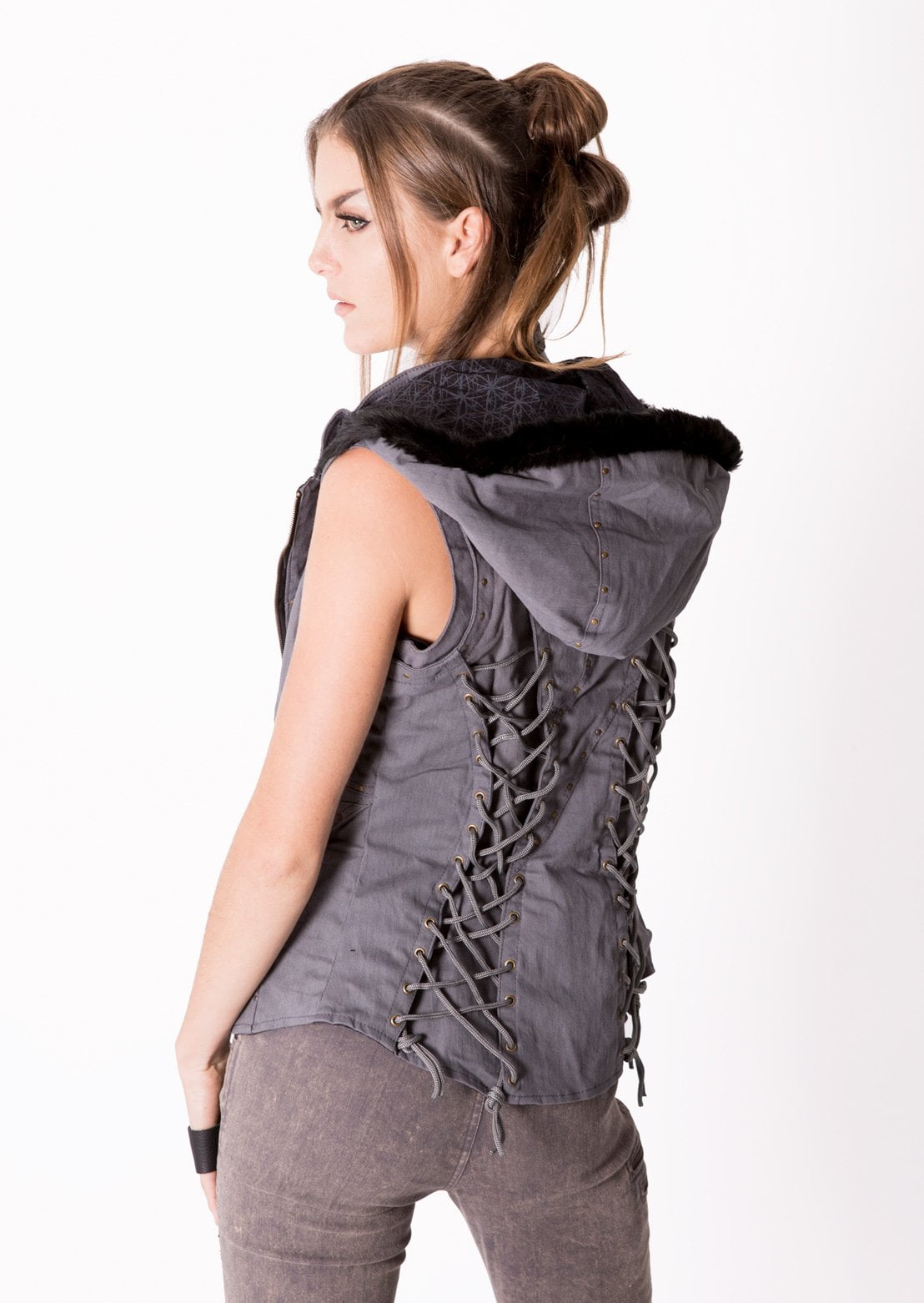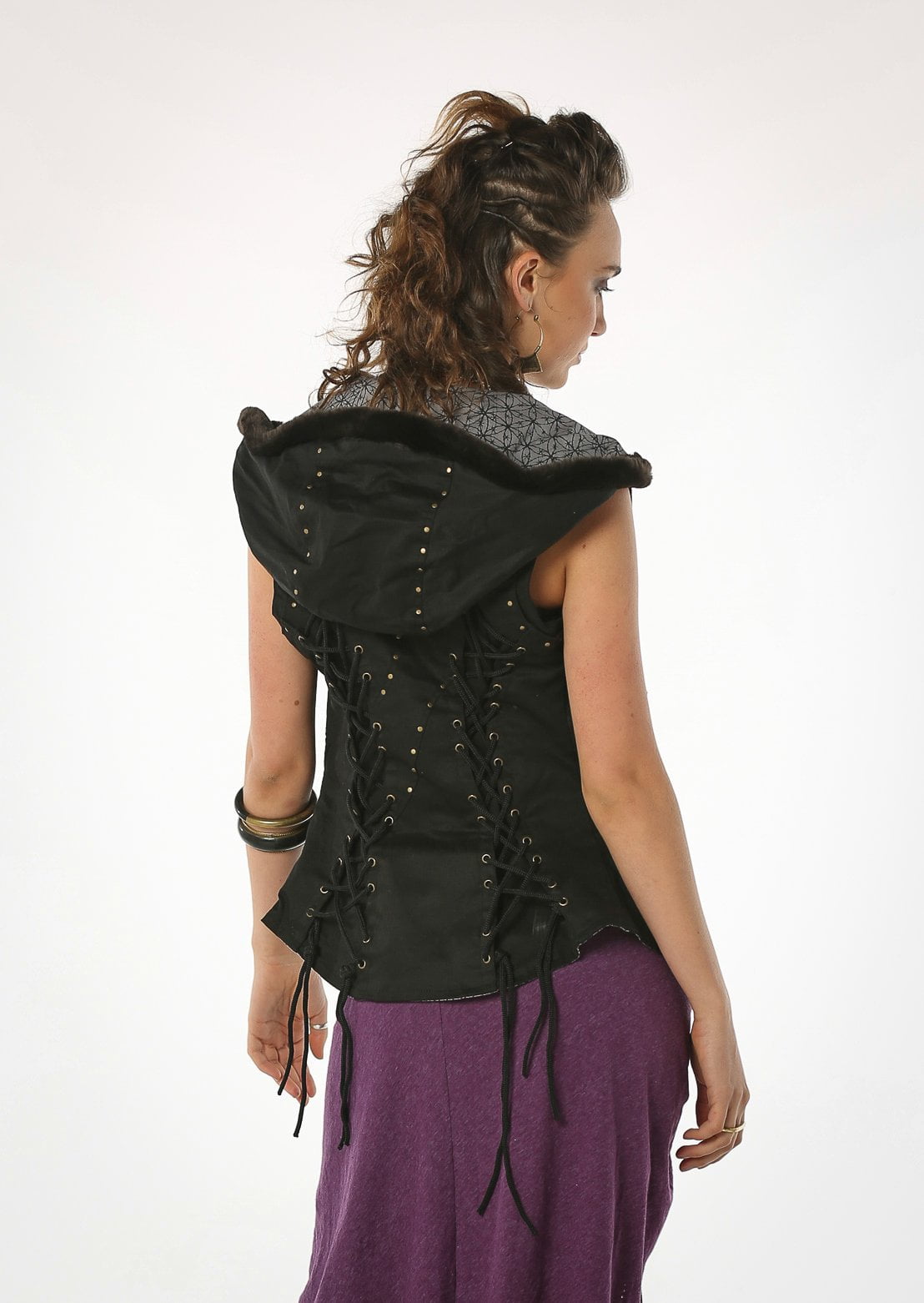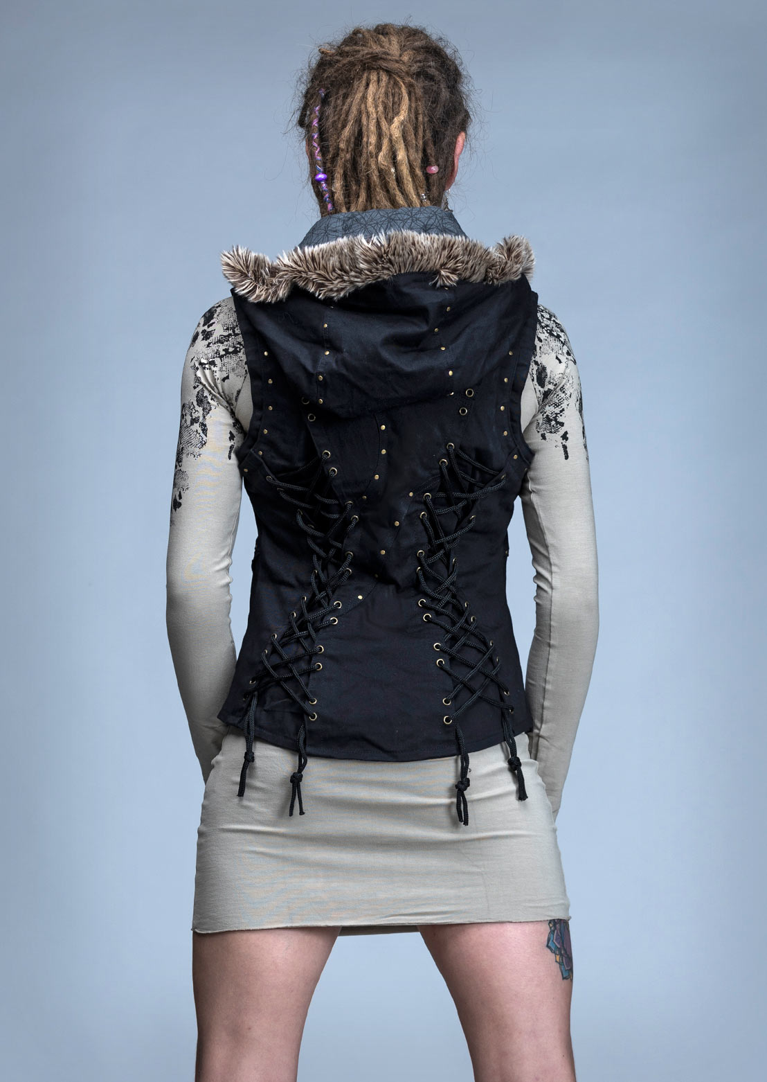 The inside of the vest and the hood are lined with the flower of life design, while the front is patterned with streams of studded lines and curves along the creative stitch work. The back of the vest opens up into two panels of lacing from the shoulders down, and is adjustable to fit perfectly around your body. The hood is lined with a shimmery faux fur to give that native look and is conveniently removable with studded clips that then form the collar. The Sphere Vest also has two spacious front pockets to complete this must have piece of art!
